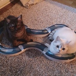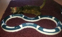Nachdem die beiden Katzen das neue Ding etwas zurückhaltend gemustert haben, sind sie dann aber immer mehr in Fahrt gekommen und kloppen mitterweile richtig an die Kugel dran, die dann in Affentempo durch diese Schiene jagt. :) Bis jetzt haben die beiden richtig viel Spaß damit, können sich eben auch mal alleine damit beschäftigen und es scheint ihnen (noch) nicht langweilig zu werden.