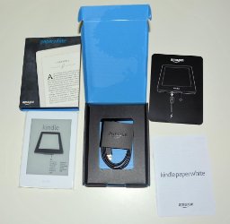 Erstmals erhalte ich ein Serienmodell des Kindle Paperwhite nicht im schwarzen, schmucklosen Karton geliefert, sondern das Gerät wird mit einer hübscheren und auch etwas kleineren Verpackung geliefert, die kaum größer ist als der enthaltene E-Reader.