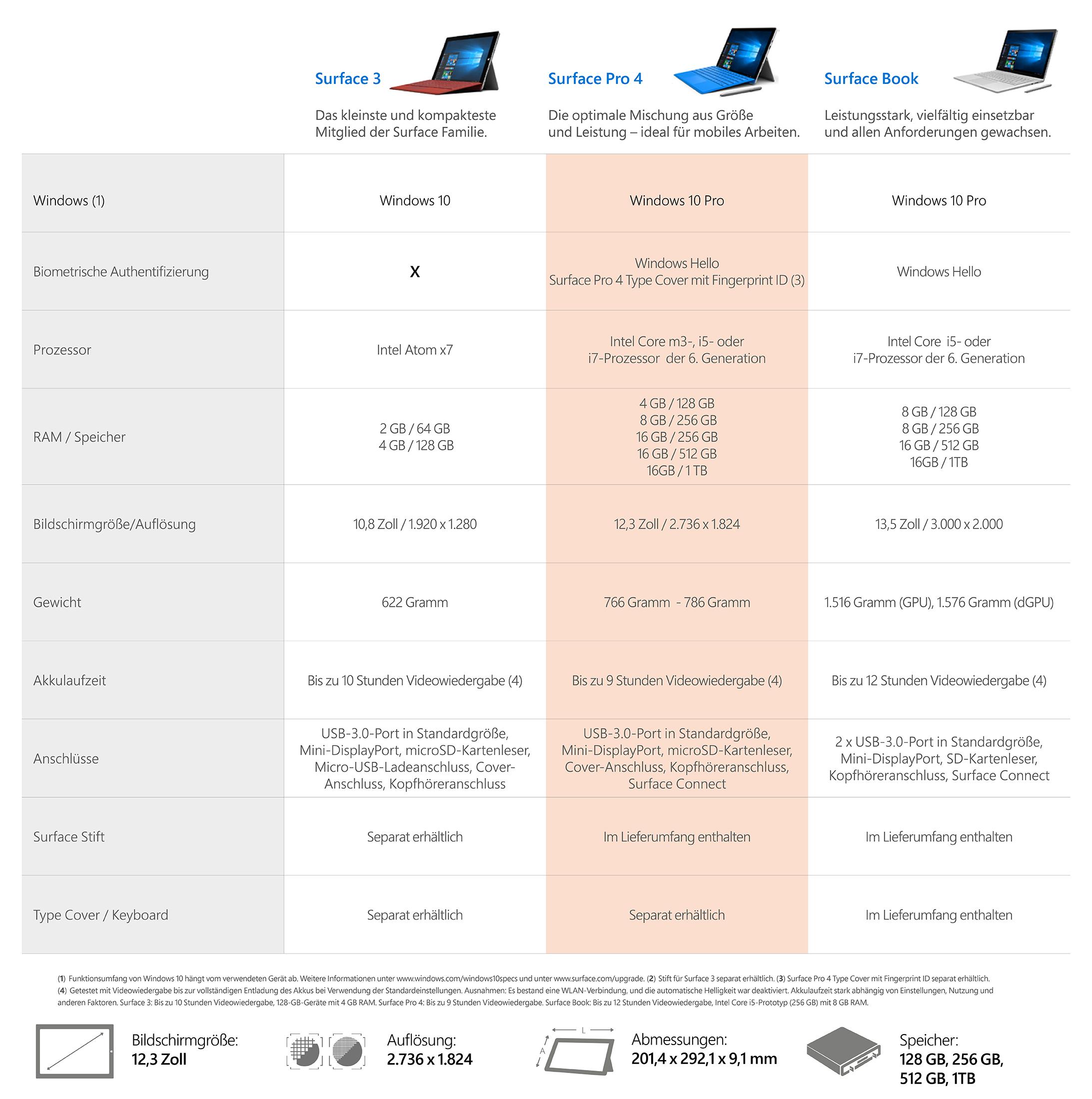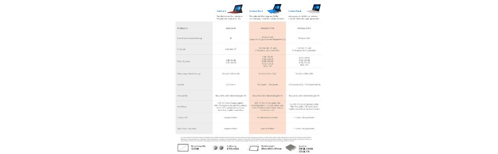 • Besonderheiten: 12,3 Zoll PixelSense-Display; Auflösung: 2.736 x 1.824 (267 ppi), Seitenverhältnis: 3:2; Toucheingabe: 10-Punkt-Multitouch; RAM: 8GB